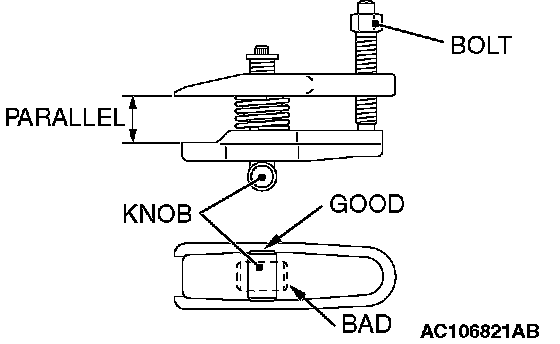 2. After turning the bolt and knob to adjust the insert arms of the special tool MB991897 in parallel, tighten the bolt by hand and confirm that the insert arms are parallel.