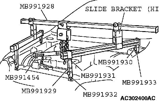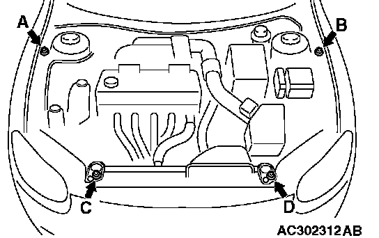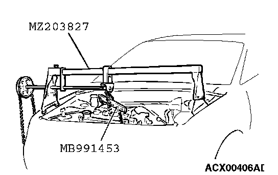 1. Set special tool MB991895 to the front fender mounting bolts (A and B) and the radiator support upper insulator mounting bolts (C and D), which are located in the engine compartment, as shown.