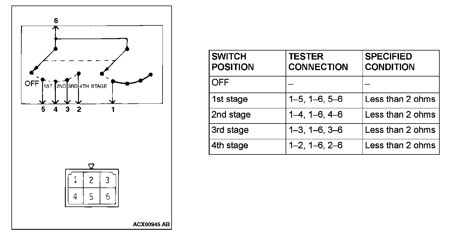 This figure illustrates a complex switch. The continuity between terminals at each position is as indicated in the table below.