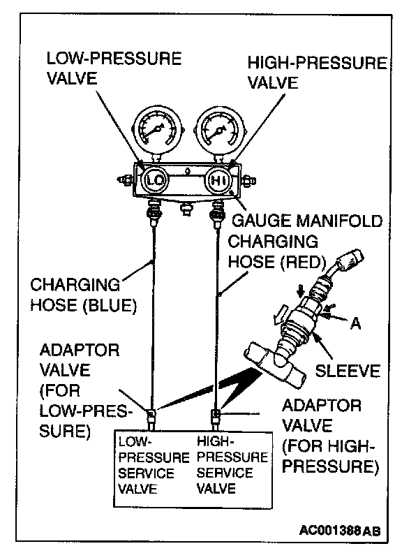 NOTE: The high-pressure service valve is on A/C pipe and the low-pressure service valve is on the suction hose.