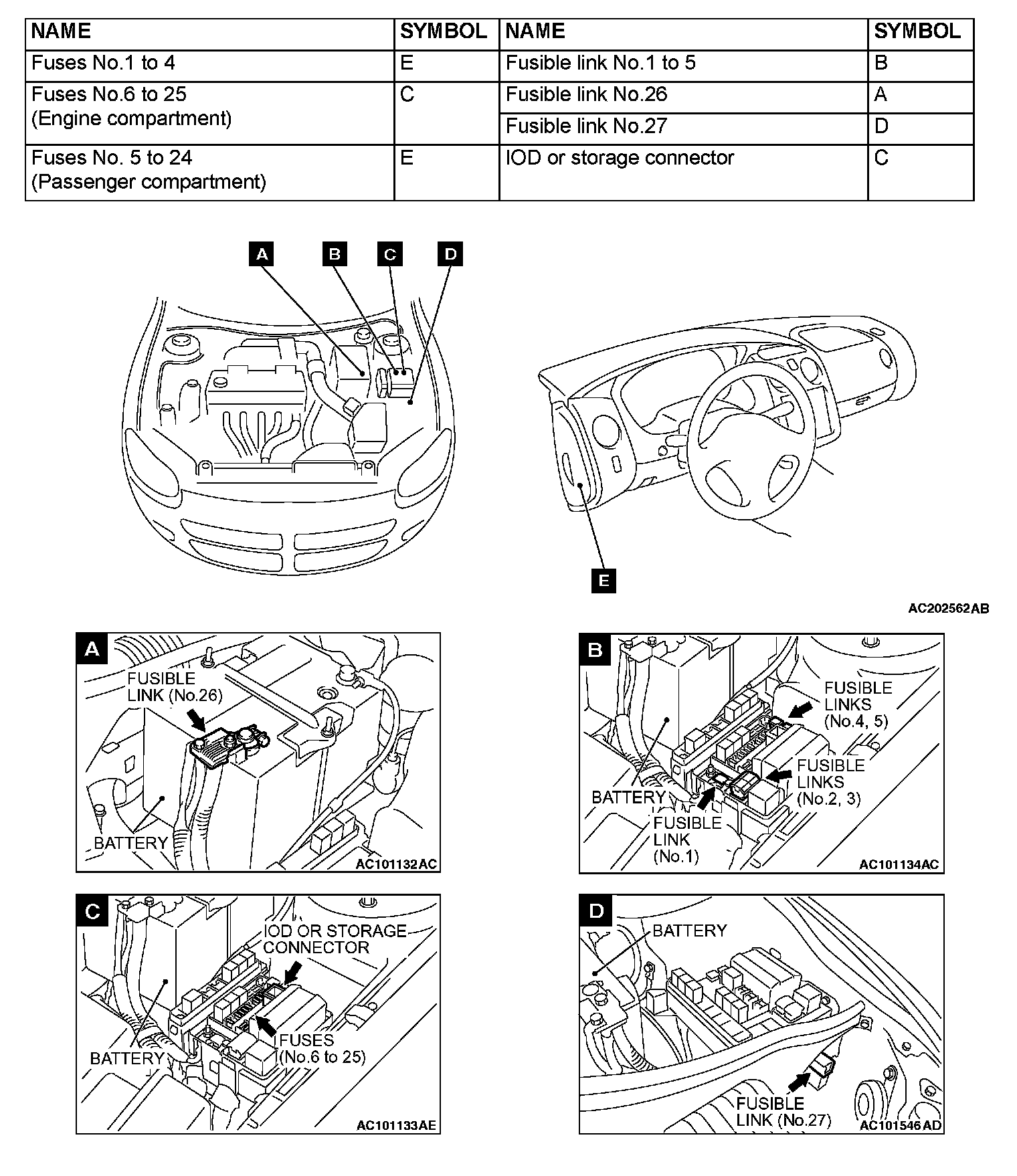 Fusible Link, Fuse And IOD Or Storage Connector Location Index, Overall View And Views A - D: