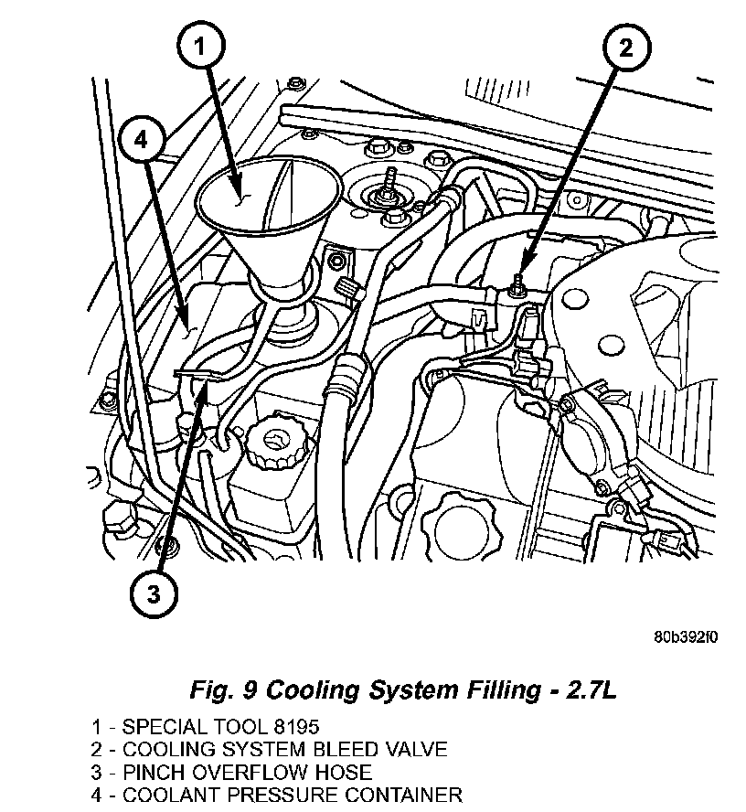 4. Remove cooling system pressure cap. Attach Special Tool 8195, Filling Aid Funnel to coolant pressure container filler neck.