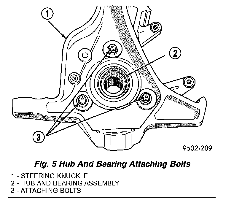 9. Remove 3 bolts attaching the hub and bearing assembly to steering knuckle (Fig. 5).