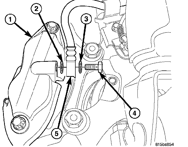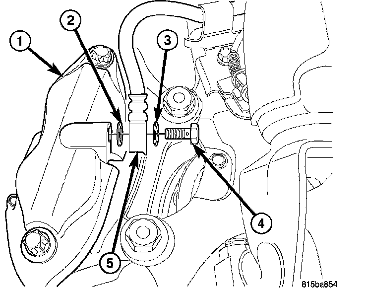 5. Install banjo bolt (4) attaching brake hose (5) to caliper (1). Install NEW washers (2, 3) on each side of hose fitting as banjo bolt is placed through banjo fitting. Thread banjo bolt into caliper and tighten to 33 Nm (24 ft. lbs.) torque.