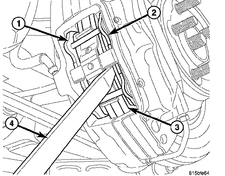 7. Using trim stick, slowly apply pressure against brake pad (2) until both pistons (on that side of caliper) are completely bottomed in bores of caliper half.