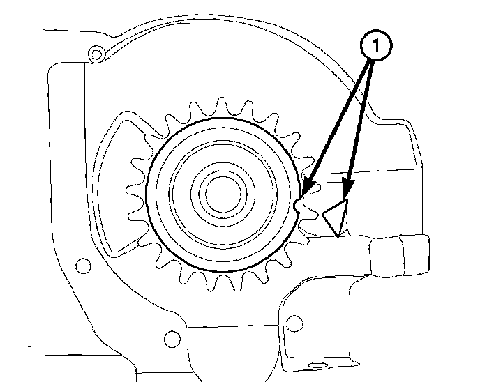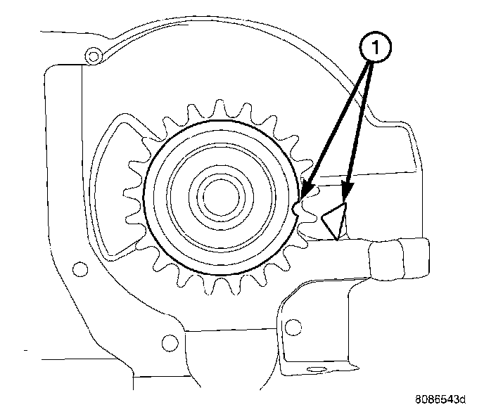 6. Ensure that crankshaft position is at 6° ATDC of No.1 cylinder, or crankshaft sprocket mark aligns with mark on oil pump (1). This position will properly locate oil pump upon installation.