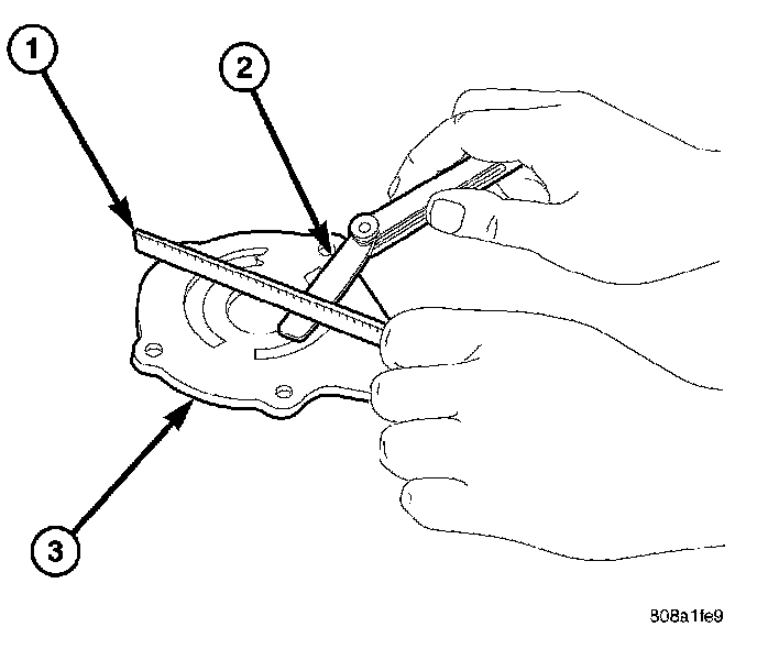 4. Lay a straightedge (1) across the pump cover (3) surface. If a 0.025 mm (0.001 inch) feeler gauge (2) can be inserted between cover and straight edge, cover should be replaced.