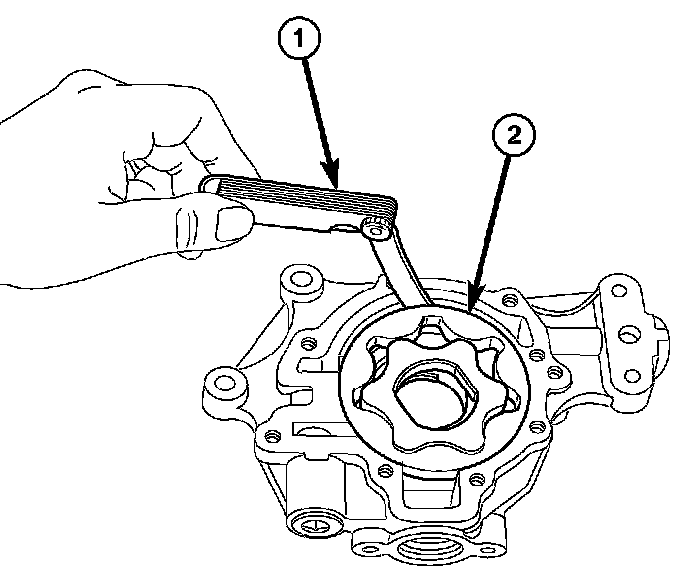 7. Slide outer rotor into body, press to one side with fingers and measure clearance between rotor and body (2). If measurement is 0.39 mm (0.015 inch) or more, replace body only if outer rotor is in specifications.