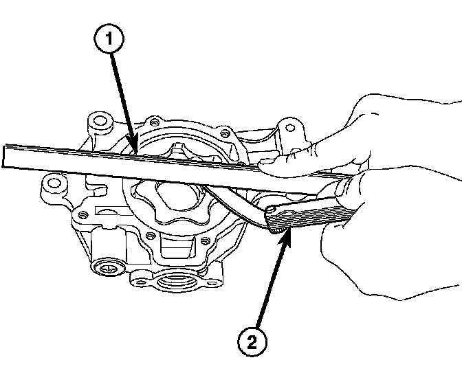 9. Place a straightedge (1) across the face of the body, between bolt holes. If a feeler gauge (2) of 0.077 mm (0.003 inch) or more can be inserted between rotors and the straightedge, replace pump assembly ONLY if rotors are in specification.