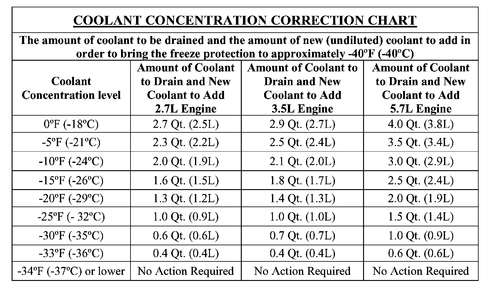 3. If the coolant is not within the proper range, use the chart to determine how much coolant must be drained and how much new undiluted) coolant must be added in order to bring the freeze protection to the appropriate -40° F (-40° C) concentration.