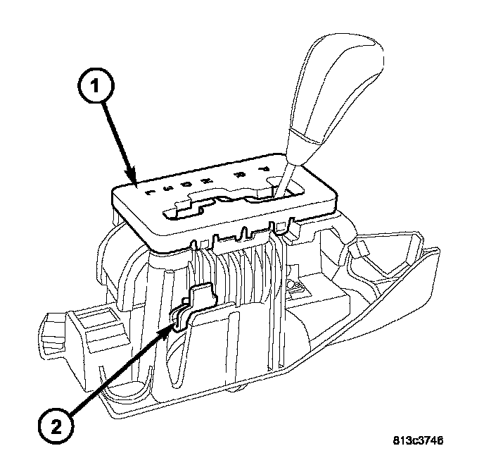 3. Depress the BTSI override (2) on the side of the shifter assembly (1).