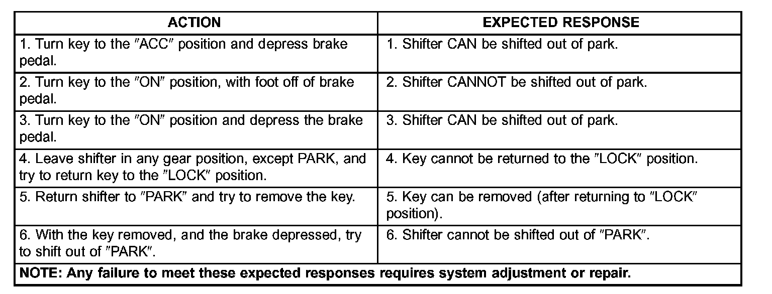 The following chart describes the normal operation of the Brake Transmission Shift Interlock (BTSI) system. If the "expected response" differs from the vehicle's response, then system repair and/or adjustment is necessary.