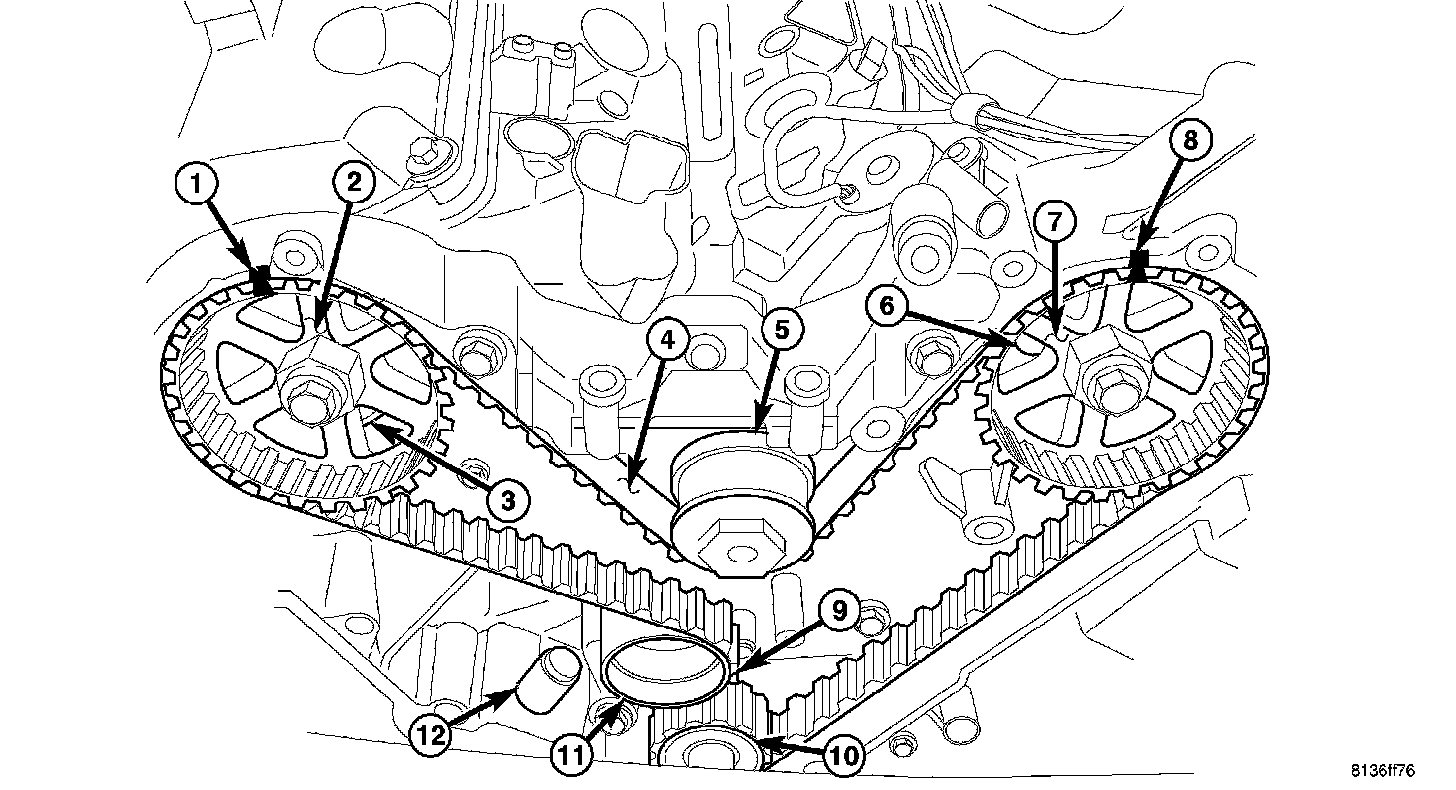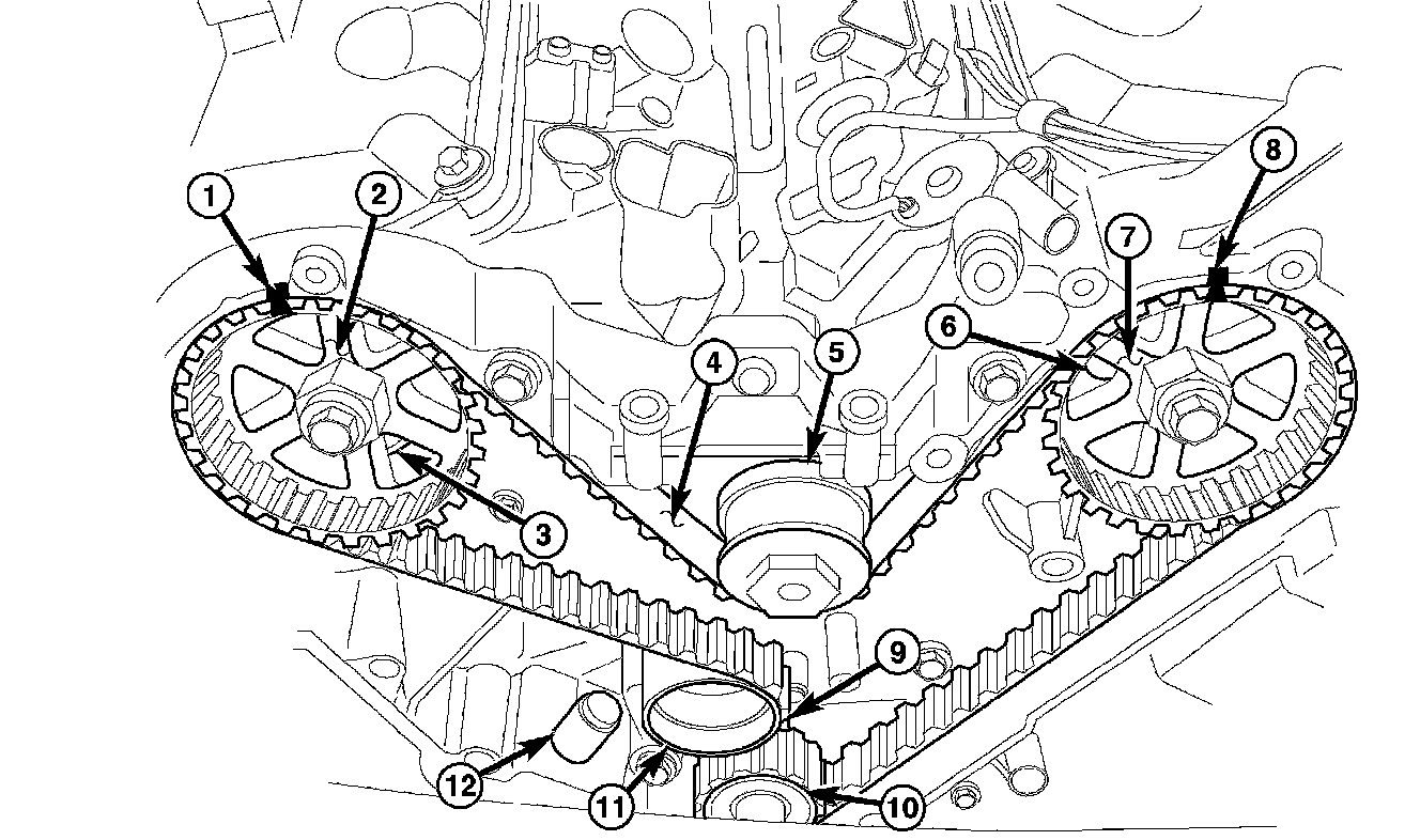 9. Install the timing belt (4) and tensioner (12).