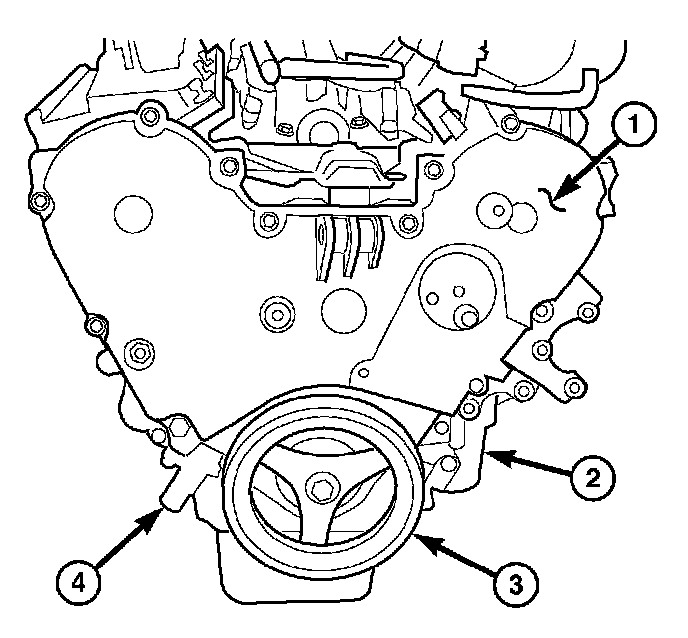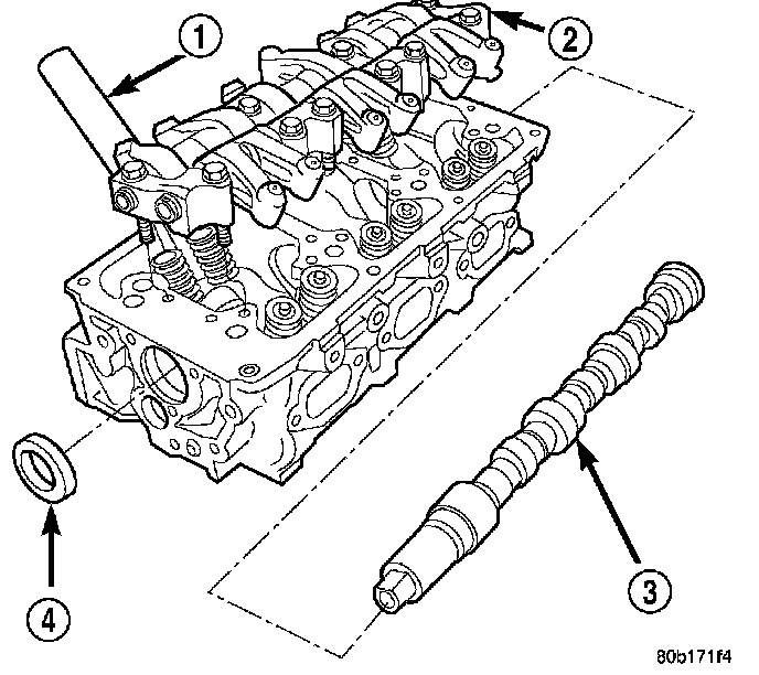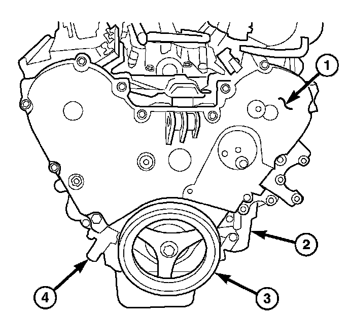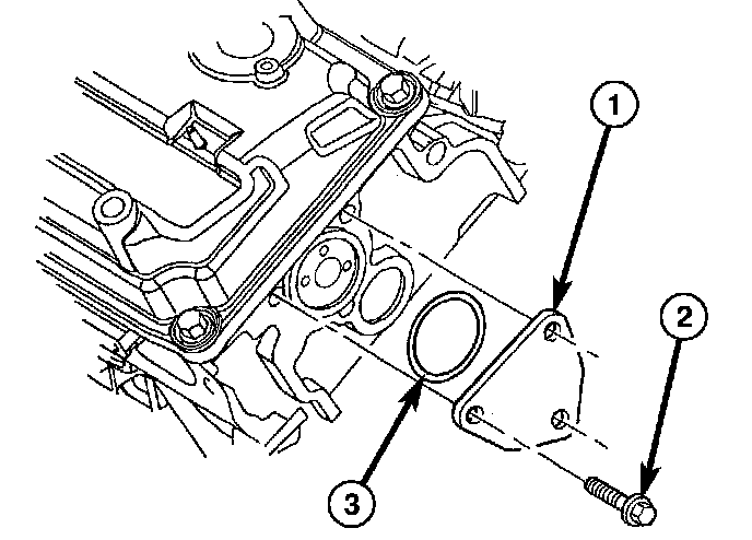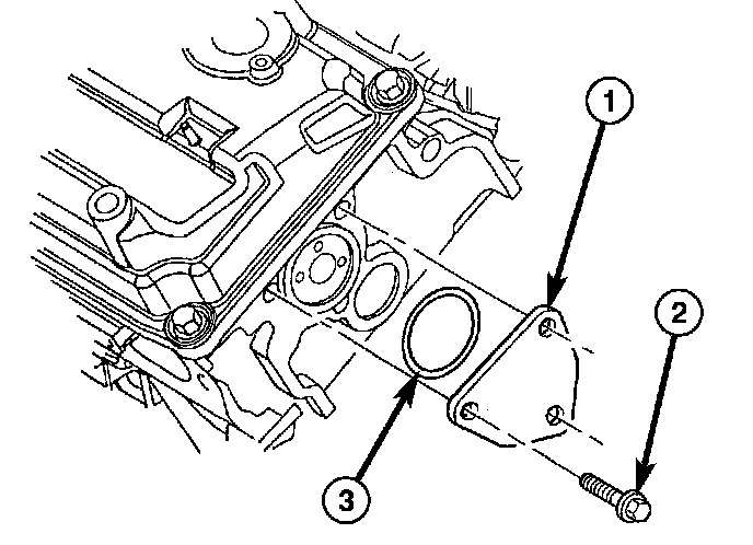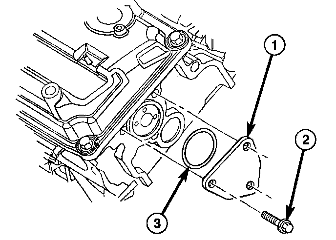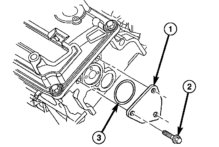 8. Install the rear camshaft thrust plate (1) and seal (3).