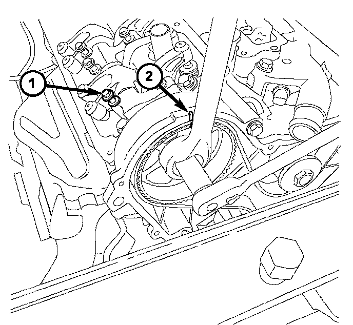 6. Install camshaft sprocket (2) Counterhold the camshaft sprocket gear (2) and tighten the camshaft sprocket bolt to 102 Nm plus a 1/4 turn (75 lbs. ft. plus a 1/4 turn).