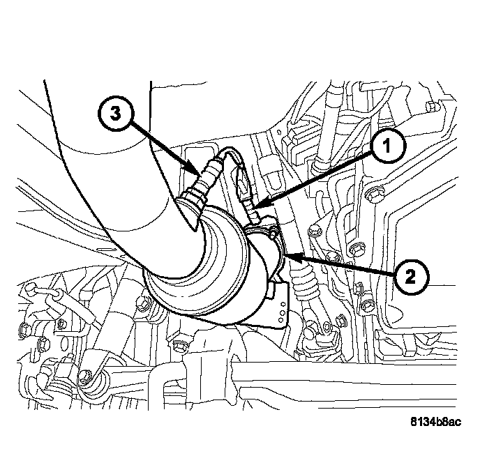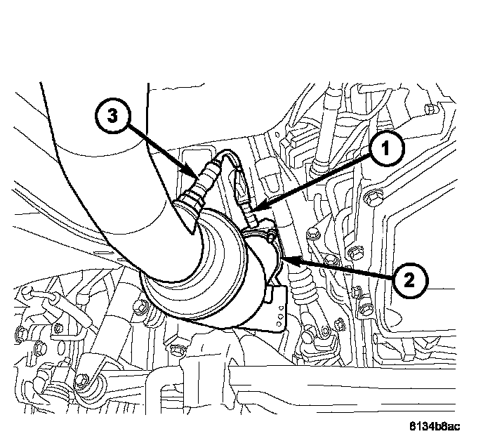 17. Connect the left exhaust pipe (2) and connect the oxygen sensor (3).