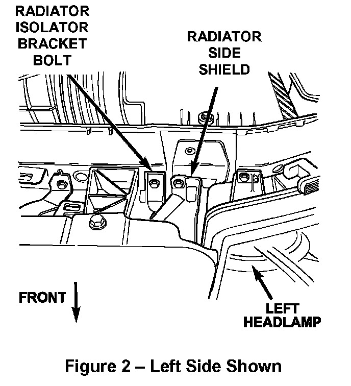3. Remove the left and right upper radiator isolator bracket bolts (Figure 2).