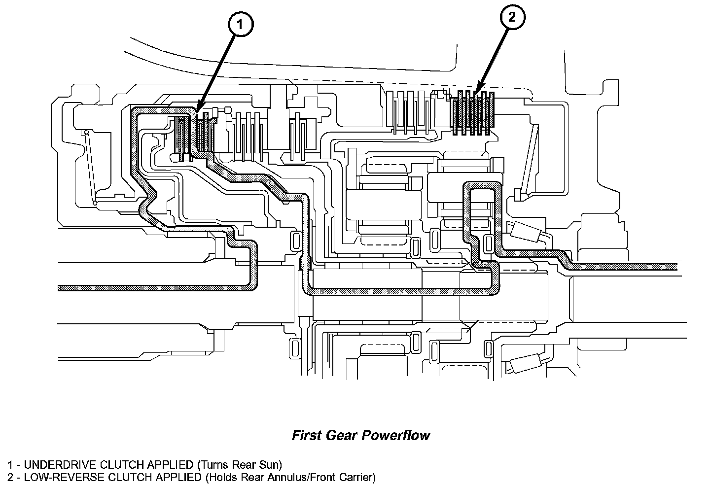 In first gear range, torque input is through the underdrive clutch (1) to the underdrive hub assembly. The underdrive hub is splined to the rear sun gear. When the underdrive clutch is applied, it rotates the underdrive hub and rear sun gear. The L/R clutch (2) is applied to hold the front carrier/rear annulus assembly. The rear sun gear drives the rear planetary pinion gears. The rear planetary pinion gears are forced to walk around the inside of the stationary rear annulus gear. The pinions are pinned to the rear carrier and cause the rear carrier assembly to rotate as they walk around the annulus gear. This provides the torque output for first gear. The other planetary gearset components are freewheeling. The first gear ratio is 2.84:1.