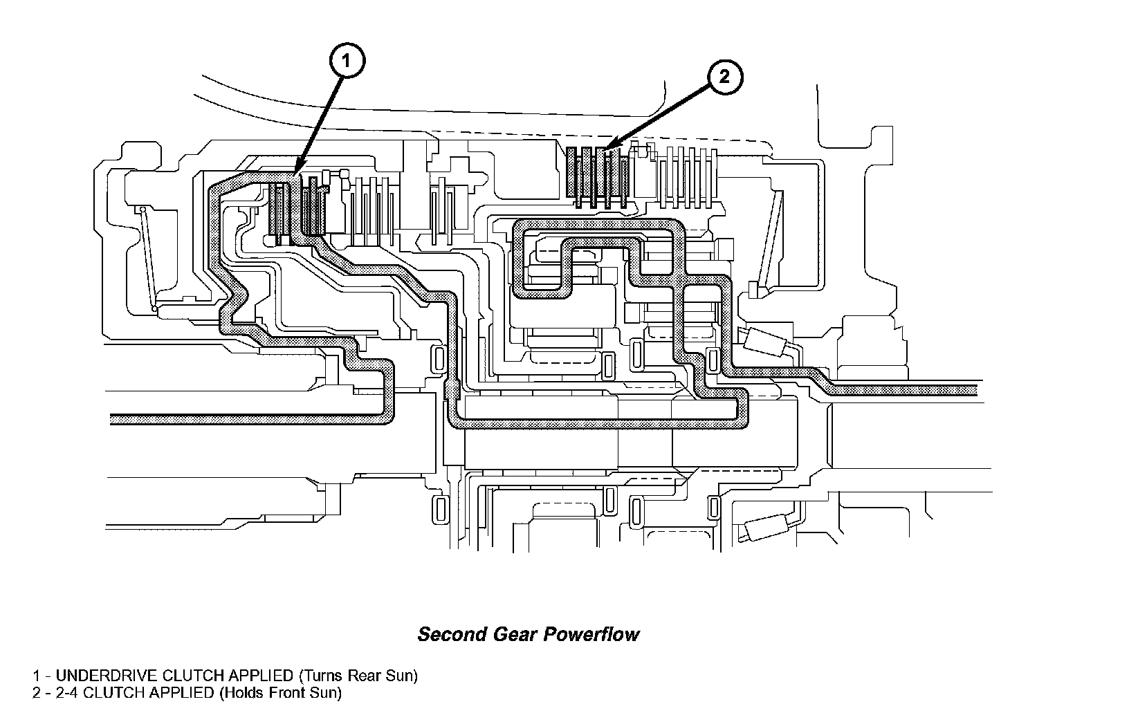 Second gear is achieved by having both planetary gear sets contribute to torque multiplication. As in first gear, torque input is through the underdrive clutch (1) to the rear sun gear. The 2/4 clutch (2) is applied to hold the front sun gear stationary. The rotating rear sun gear turns the rear planetary pinions. The rear pinions rotate the rear annulus/front carrier assembly. The pinions of the front carrier walk around the stationary front sun gear. This transmits torque to the front annulus/rear carrier assembly, which provides output torque and a gear ratio of 1.57:1.