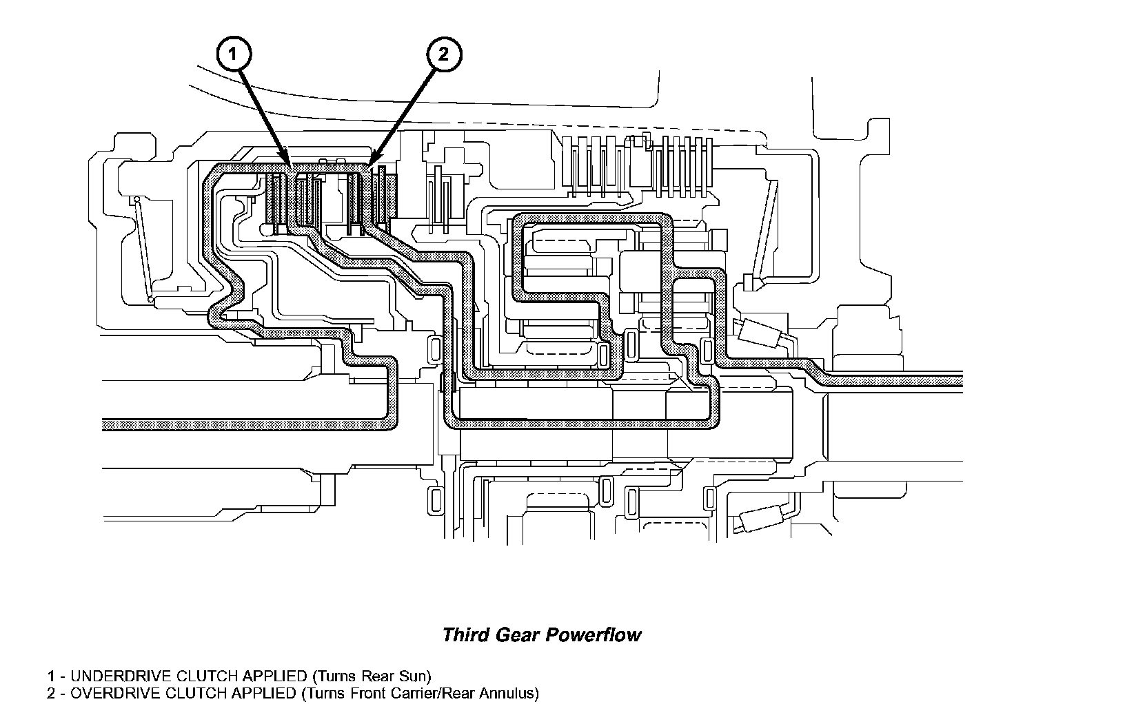 In third gear, two input clutches are applied to provide torque input: the underdrive clutch (1) and overdrive clutch (2). The underdrive clutch rotates the rear sun gear, while the overdrive clutch rotates the front carrier/rear annulus assembly. The result is two components (rear sun gear and rear annulus gear) rotating at the same speed and in the same direction. This effectively locks the entire planetary gearset together and is rotated as one unit. The gear ratio in third is 1:1.