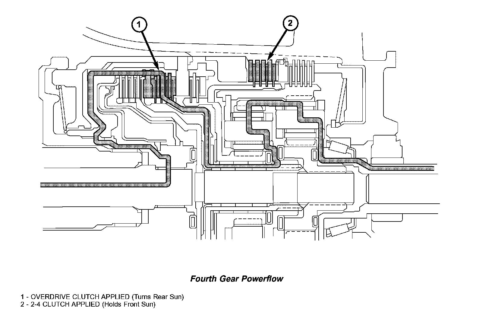 In fourth gear input torque is through the overdrive clutch (1) which drives the front carrier. The 2/4 clutch (2) is applied to hold the front sun gear. As the overdrive clutch rotates the front carrier, it causes the pinions of the front carrier to walk around the stationary front sun gear. This causes the front carrier pinions to turn the front annulus/ rear carrier assembly which provides output torque. In fourth gear, transmission output speed is more than engine input speed. This situation is called overdrive and the gear ratio is 0.69:1.
