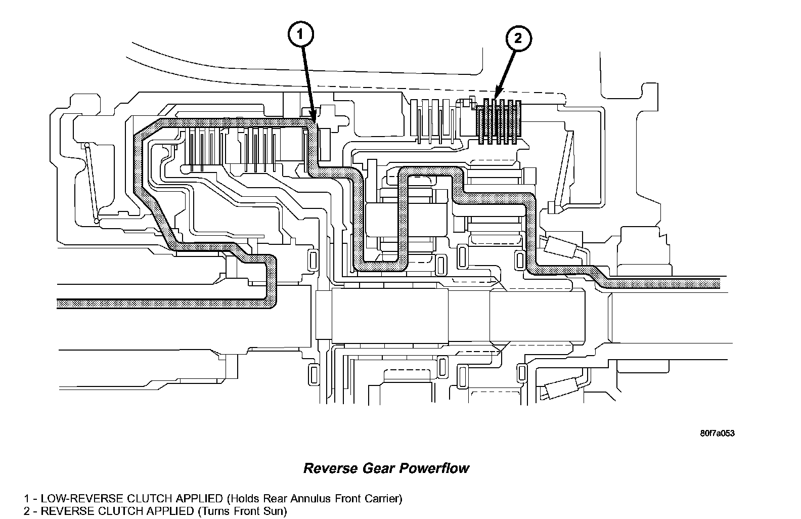 In reverse, input power is through the reverse clutch (1). When applied, the reverse clutch drives the front sun gear through the overdrive hub and shaft. The L/R clutch (2) is applied to hold the front carrier/rear annulus assembly stationary. The front carrier is being held by the L/R clutch so the pinions are forced to rotate the front annulus/rear carrier assembly in the reverse direction. Output torque is provided, in reverse, with a gear ratio of 2.21:1.