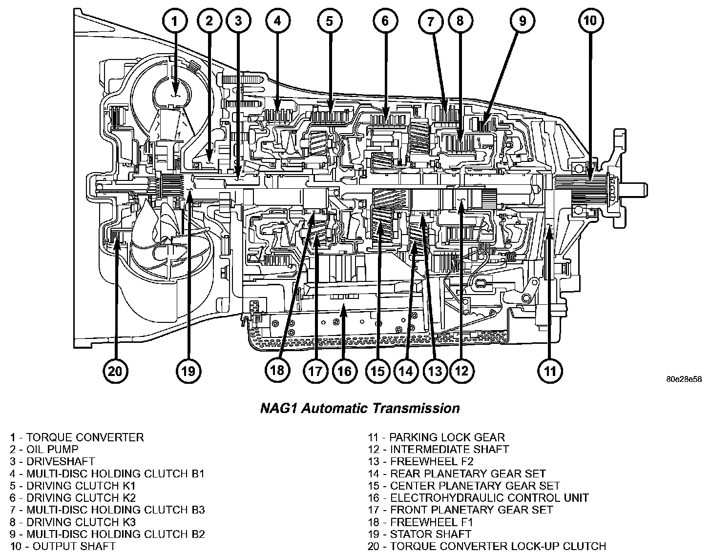 The NAG1 automatic transmission is an electronically controlled 5-speed transmission with a lock-up clutch in the torque converter. The ratios for the gear stages are obtained by 3 planetary gear sets. Fifth gear is designed as an overdrive with a high-speed ratio.