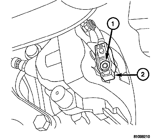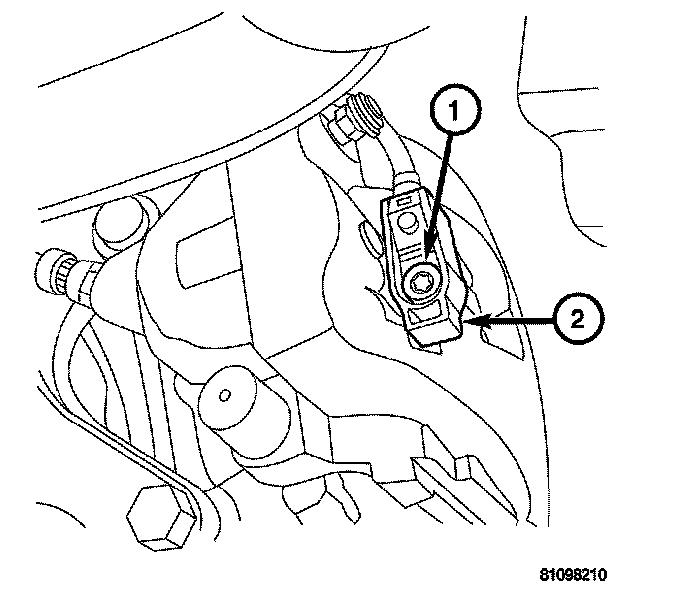 5. Remove brake pad wear indicator (1) from caliper (2) by removing the retaining bolt.