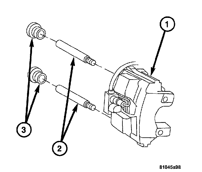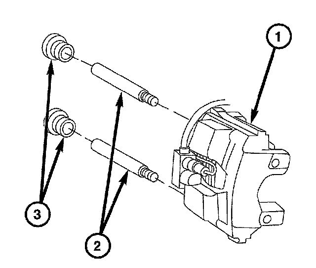 2. Lubricate the slide pins (2) and slide pin bushings with silicone grease.