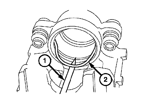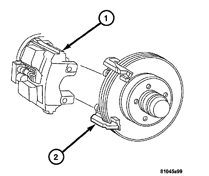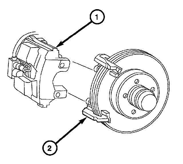 7. Remove the caliper support spring (2) by prying the spring out of the caliper (1).