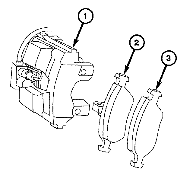 1. Install the inboard and outboard brake pads (2 and 3) onto the caliper (1).