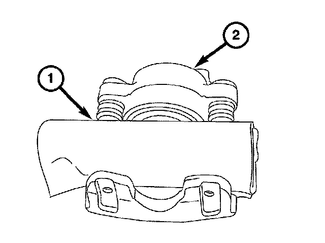 2. Take a piece of wood and pad it with a one-inch thickness of shop towels. Place this piece (1) on the outboard side of the caliper (2) in front of the piston.