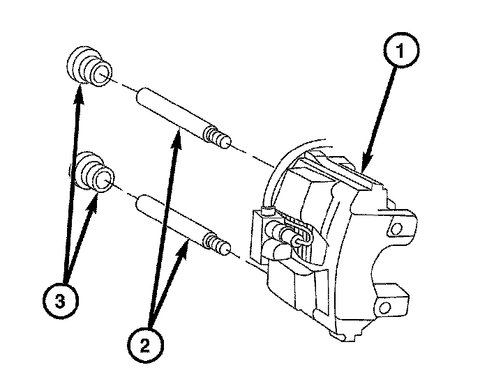 8. Remove the caliper slide pin caps (3) and slide pins (2) from the caliper (1).