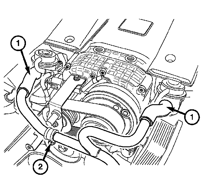 8. Install the air pump tube assembly (1) and install the retaining bolts (2).