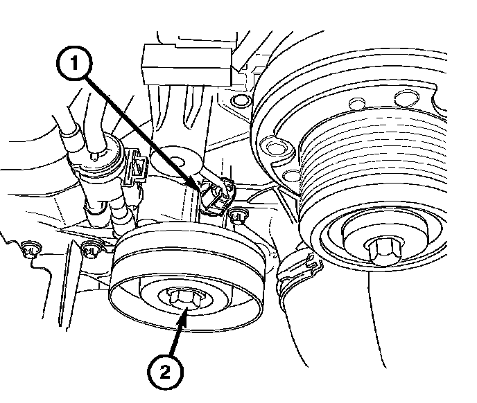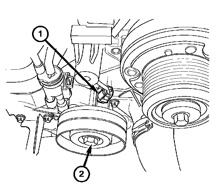 10. Remove the accessory drive belt idler pulley (2) to gain access to the engine coolant temperature sensor (1).