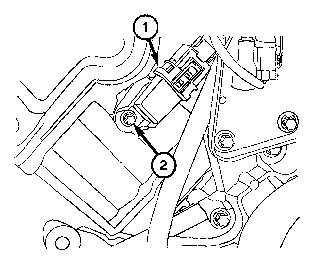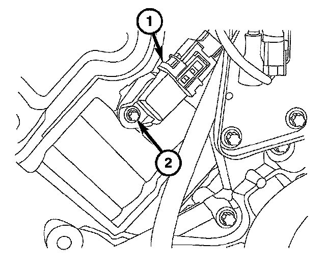 10. Disconnect the camshaft position sensor harness connector (1) and remove the bolt (2) and the sensor. (right side only).