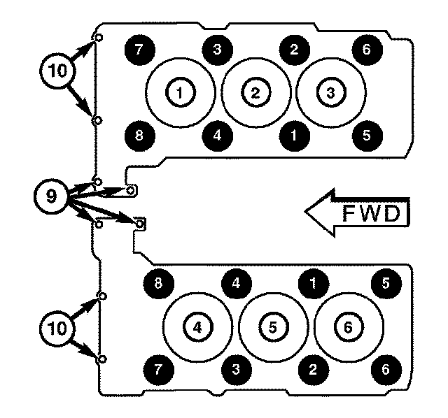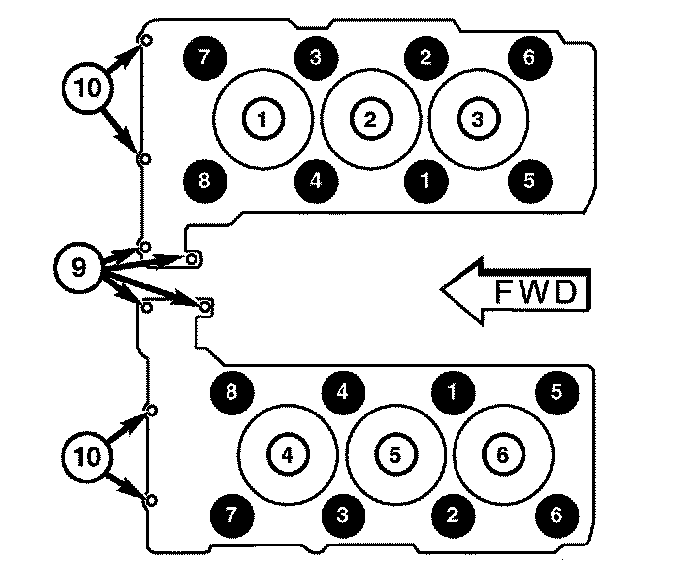 Note: Bolts numbered 9 and 10 are timing chain cover bolts. They should be tightened after the cylinder head bolts are tightened.