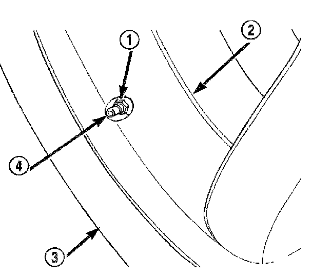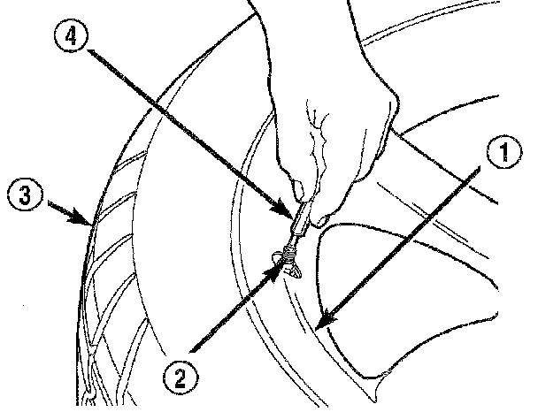 6. Remove the nut (1) mounting the valve stem (4) of the pressure sensor/transmitter to the wheel (2). Drop sensor/transmitter into the tire (3).