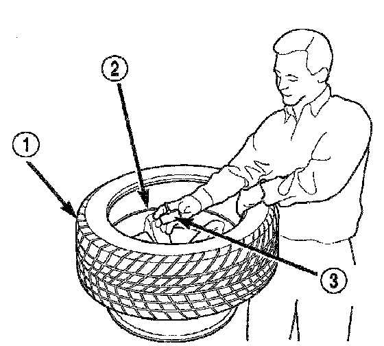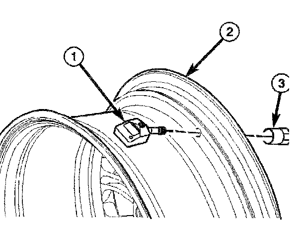 9. Pull upward on the tire (1). Reach inside the tire and remove the pressure sensor/transmitter (3).