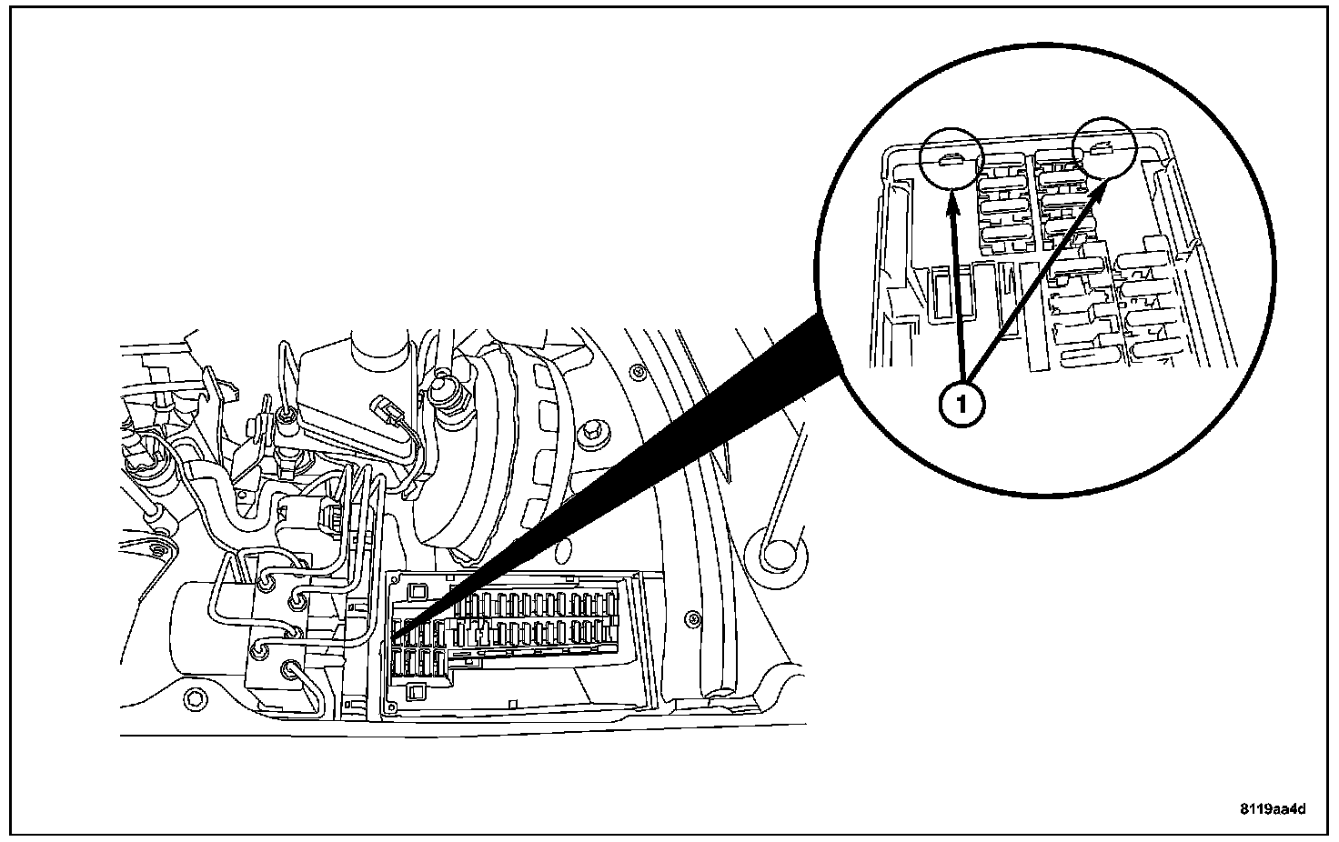 2. Push the underhood accessory fuse block down into the box until the rear tabs and the front two tabs (1) connect.