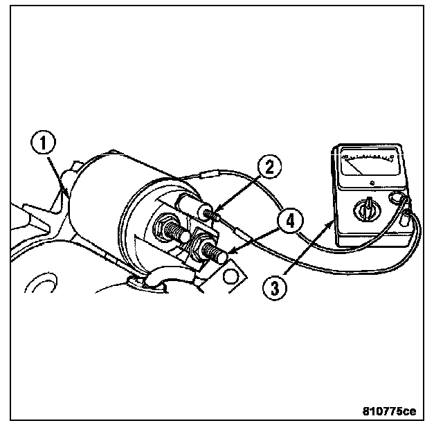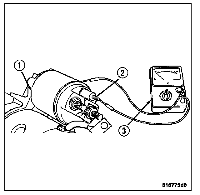 4. Using a continuity tester (3), check for continuity between the solenoid terminal (2) and the solenoid case (1). There should be continuity. If not OK, replace the faulty starter motor assembly.