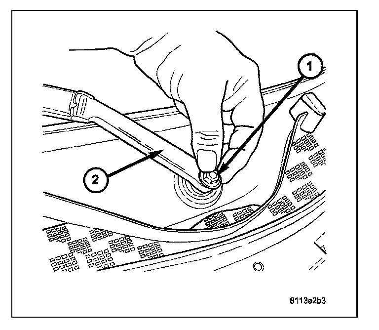 5. Press the plastic nut cap (1) into the wiper arm (2) to cover the wiper arm attachment nut.