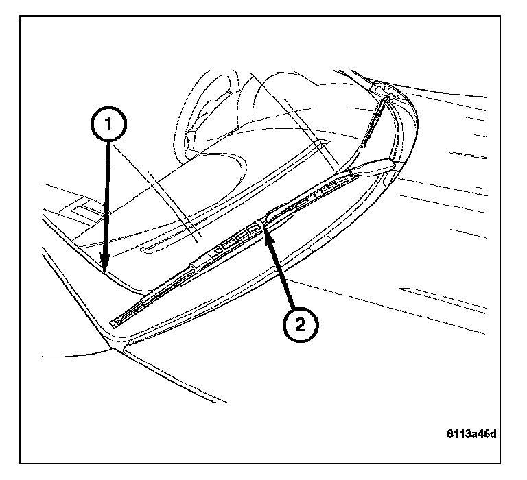 4. Align the center of the wiper blade (2) with the top of the dot matrix (1) on the bottom of the windshield. Torque the wiper arm retaining nut to 19 N.m (14 ft. lbs.).