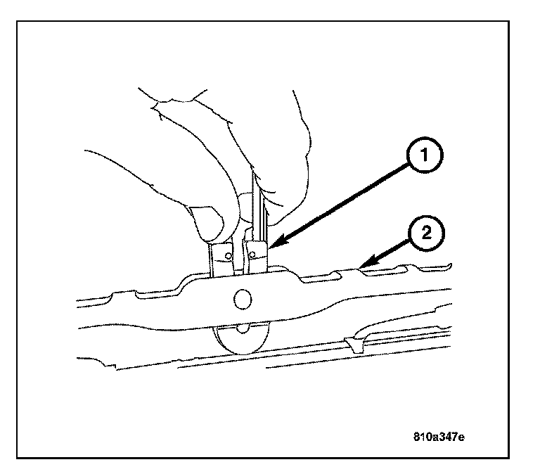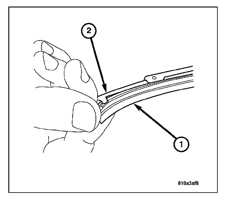 2. Index the wiper element (1) into the wiper blade retention slots (2).
