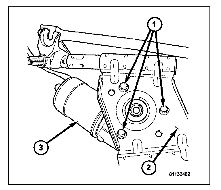 2. Install the three wiper motor retaining bolts (1). Tighten bolts to 11 N.m (8 ft. lbs.).