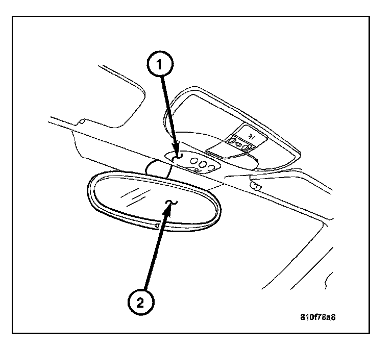 An Automatic Day/Night Rear View Mirror System is standard on this model. It is a completely self-contained unit (2) which is located at the top and center of the windshield. The mirror sensitivity cannot be repaired or adjusted; if any components of the mirror unit itself are faulty or damaged, the entire automatic day/night inside rear view mirror assembly must be replaced.