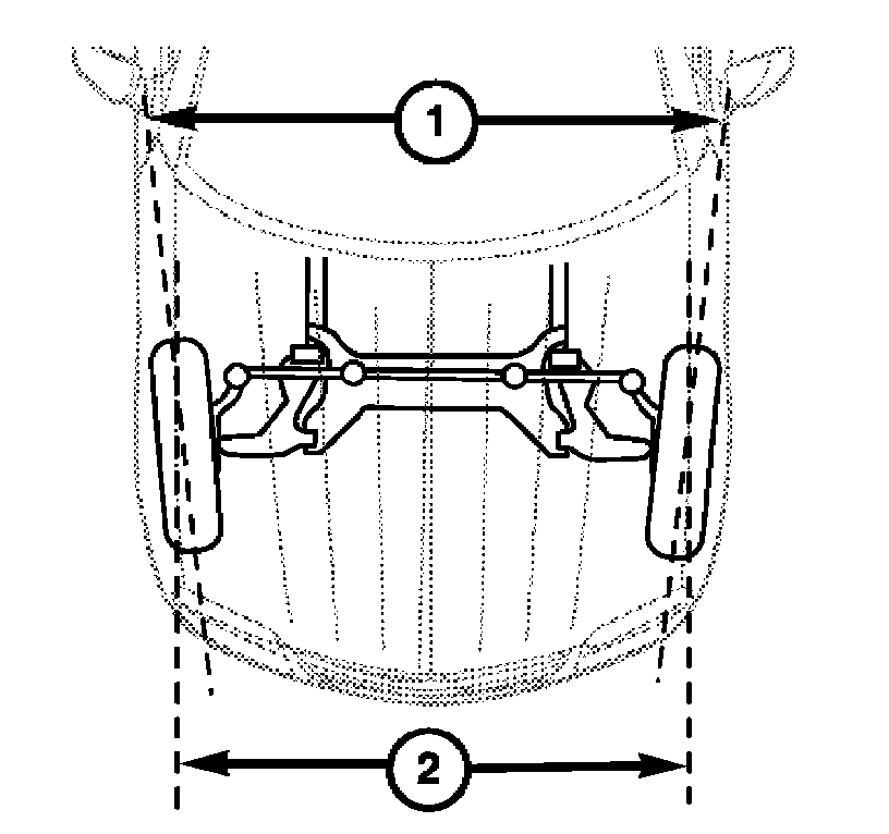 Toe-out on turns is the relative positioning (1) of the front wheels while steering through a turn. This compensates for each front wheel's turning radius. As the vehicle encounters a turn, the outboard wheel must travel in a larger radius circle than the inboard wheel. The steering system is designed to make each wheel follow its particular radius circle. To accomplish this, the front wheels must progressively toe outward as the steering is turned from center. This eliminates tire scrubbing and undue tire wear when steering a vehicle through a turn.