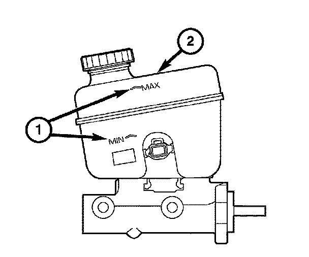 The reservoir (2) has a MIN and a MAX mark (1) on the side. Always fill to the MAX mark.