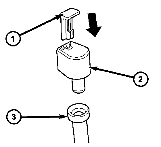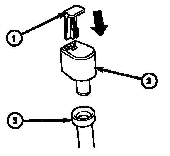 10. Once the oil level is correct, install a new dipstick tube cap (2) and lock pin (1). I l