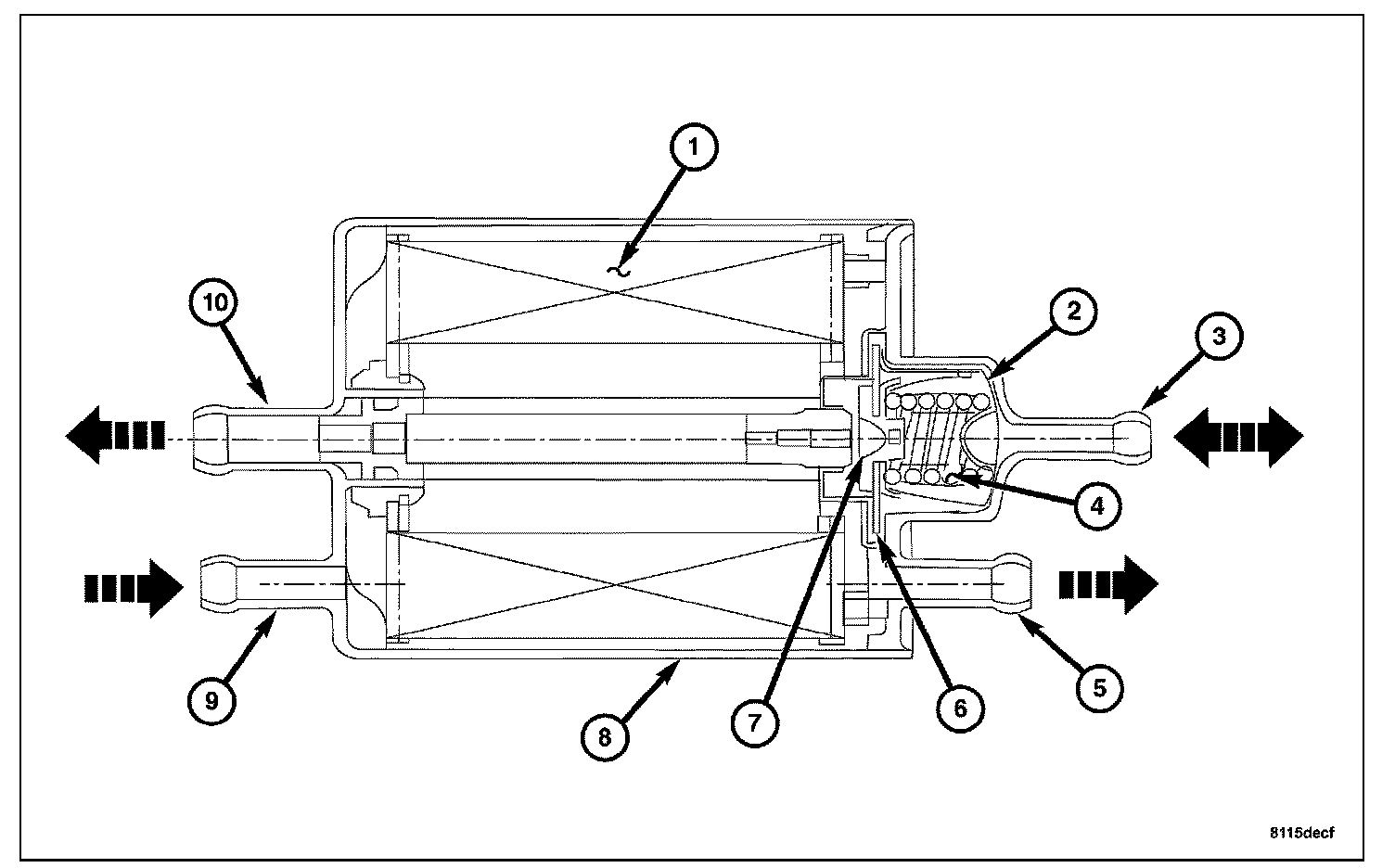The combination Fuel Filter/Fuel Pressure Regulator (4) consists of a housing with an integrated filter element. The fuel flows through the filter from the outside to the inside. As a result, any impurities are trapped inside the filter.